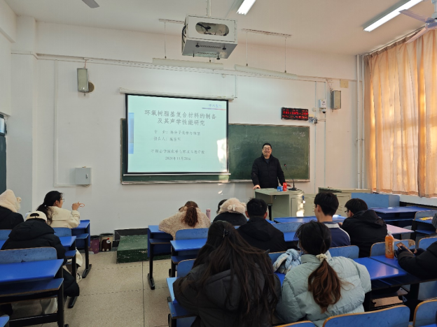 2024年11月28日下午16时,beats365中文官网施雪军博士在4号教学楼4203教室举办了学术讲座,报告题目为《环氧树脂基复合材料的制备及其声学性能研究》,公司22级材料科学与工程专业的员工聆听了本次报告。