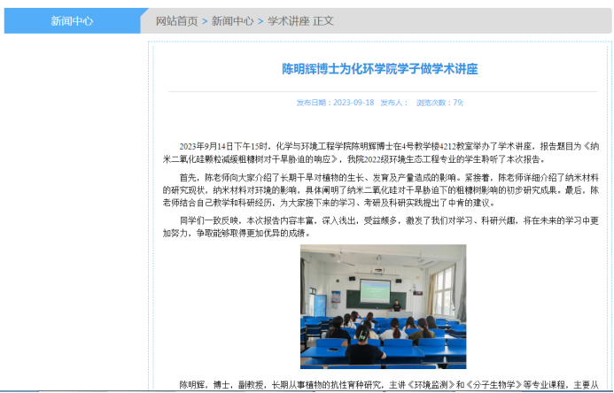 2024年12月19日下午15:00-16:30时,beats365中文官网陈明辉博士在4号教学楼4314教室举办了学术讲座,报告题目为《纳米氧化铜减缓粗糠树对低温胁迫的响应研究》,公司2024级环境生态工程专业的员工们聆听了本次报告。