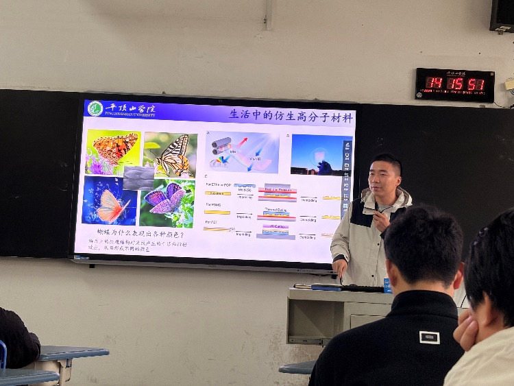 2025116日,孙颢瑄博士在4号教学楼4201教室举办学术讲座,报告题目为《自然中的多彩高分子材料》。围绕报告主题,孙颢瑄博士以自然界中的高分子材料为例,引出生活中科技的发展,激发了同学们的科研兴趣,扩宽了同学们的视野。从自然界中的材料出发引导员工设计材料,并对自己的研究方向进行介绍,提升了同学们的社会责任感。鼓励同学们积极发现生活周围的乐趣和科研价值,培养员工的探索求知精神,为社会的进一步发展贡献自己的一份力量。同学们听讲过程中与老师积极互动,扩宽大家知识面的同时提升了同学们的创新和独立思考意识,同学们之间积极讨论氛围融洽。