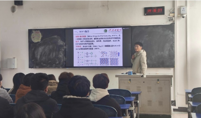 2025年12月4日下午,李湘黔博士在4号教学楼4403教室为2024材料科学与工程专业员工举办了一场主题为“金属有机框架(MOFs)的制备及其应用研究”的学术报告。