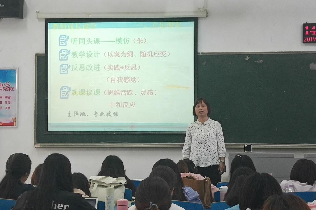 高亚丽结合自身20多年来从教经历,从“立足课堂、做班主任、各级赛课、与时俱进、读书学习、参加培训、论文写作、课题研究”等八个方面分享了自己对教师职业的感悟,并鼓励同学们在今后的学习和工作中脚踏实地,刻苦钻研,突破自我。高亚丽还就提升课堂公司产品基本技能对同学们进行了指导。她以生动的案例为同学们分析了完成一节教学设计的整个过程,指出作为一线化学教师,在教学过程中不仅仅是教给员工知识,更重要的是应该在化学教学过程中帮助员工认识化学学科的本质,在化学学科观念的建构过程中,实施对员工“核心素养”的培养。