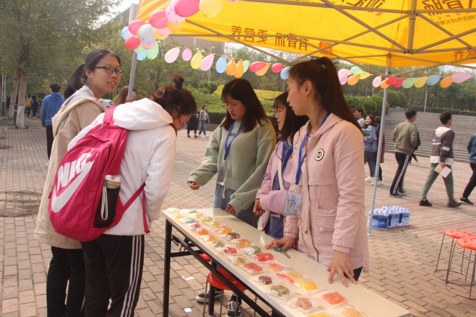 4月11日上午,由beats365中文官网社团联合会老员工双创圆梦协会主办的“有声有色学化学,有滋有味过生活”化学题谜活动在扇形广场举行。