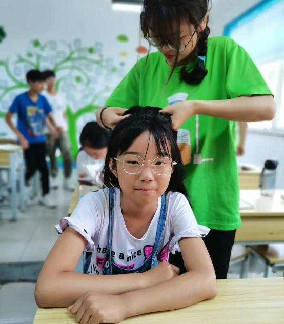 小朋友和志愿者老师第一次见面,起初他们还有点害羞,后来经过一番接触,和老师们逐渐熟悉起来,志愿者给小朋友扎辫子,和员工一起打乒乓球,不知不觉中拉近了彼此间的距离。