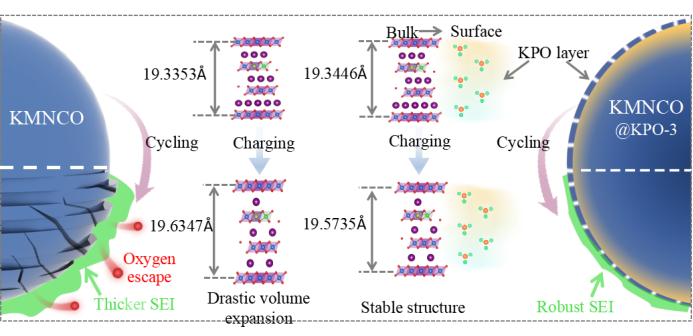 P3型KMnO2因其无毒、高比容量和低成本的优点被认为是规模化储能钾离子电池的正极材料之一。然而,嵌脱钾过程中因其较大的静电斥力易因其层间滑移,导致不可逆相变和结构退化,本论文提出磷掺杂诱导晶格调控与KPO表面涂层的协同策略,强电负性P-O键减少了晶格氧逸出,纳米涂层缓解了电解液对材料的侵蚀,实现了KMNCO@KPO电极展现出更强的结构稳定性和优异的循环性能,该研究结果对钾离子电池在储能领域中的实际应用提供了新的思路。论文链接:https://doi.org/10.1016/j.nanoen.2025.110813。