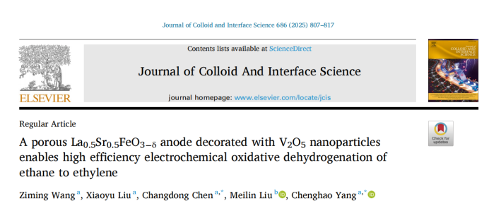 另外,双方合作在国际著名期刊《Journal of Colloid And Interface Science》(中科院1区,TOP期刊,影响因子9.4)上发表“A porous La0.5Sr0.5FeO3−δ anode decorated with V2O5 nanoparticles enables high efficiency electrochemical oxidative dehydrogenation of ethane to ethylene”的研究论文,beats365中文官网、尧山实验室陈昌东博士和华南理工大学杨成浩教授为通讯作者。