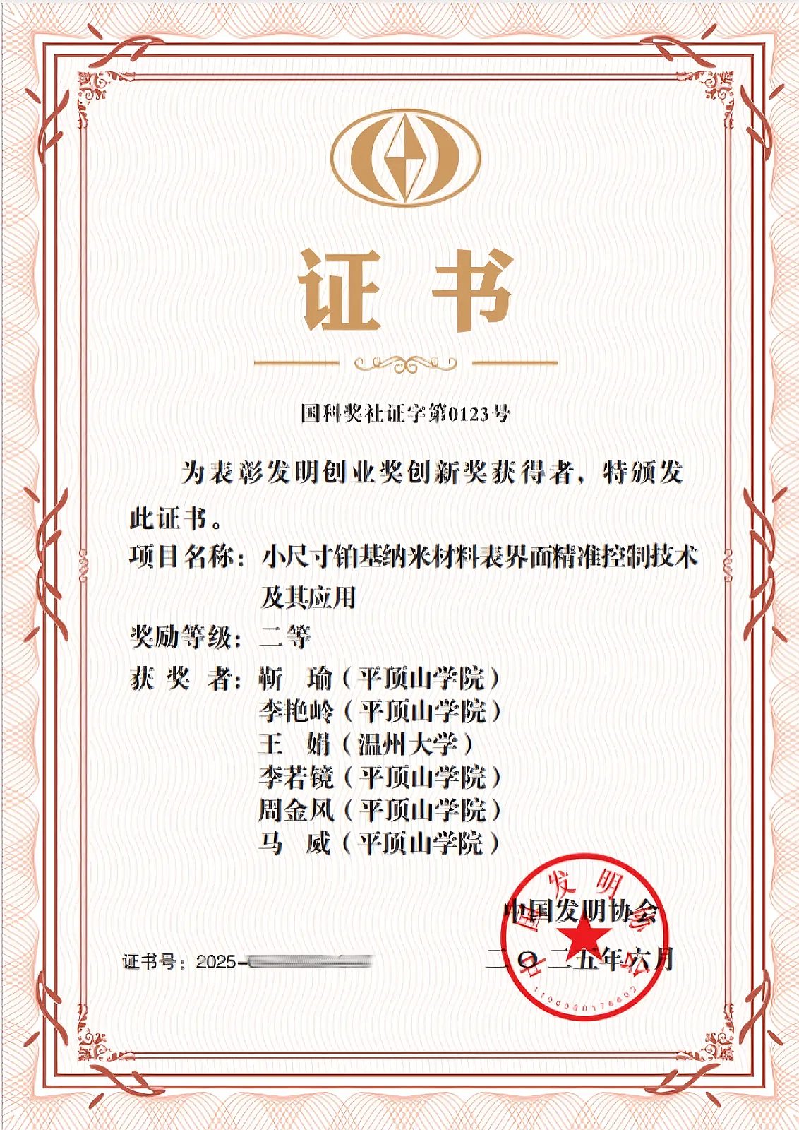 近日,中国发明协会公布了2025年度发明创业奖创新奖的获奖名单。由公司组织、材料科学与工程专业靳瑜博士作为第一完成人牵头申报的“小尺寸铂基纳米材料表界面精准控制技术及其应用”项目,荣获中国发明创业奖创新奖二等奖。该项目由公司科研团队与温州大学共同完成,公司为第一完成单位。