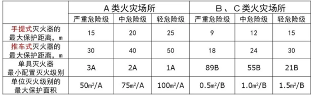 对不同危险等级的场所,灭火器的最低配置基准、最大保护距离等要求各有不同,参见下表: