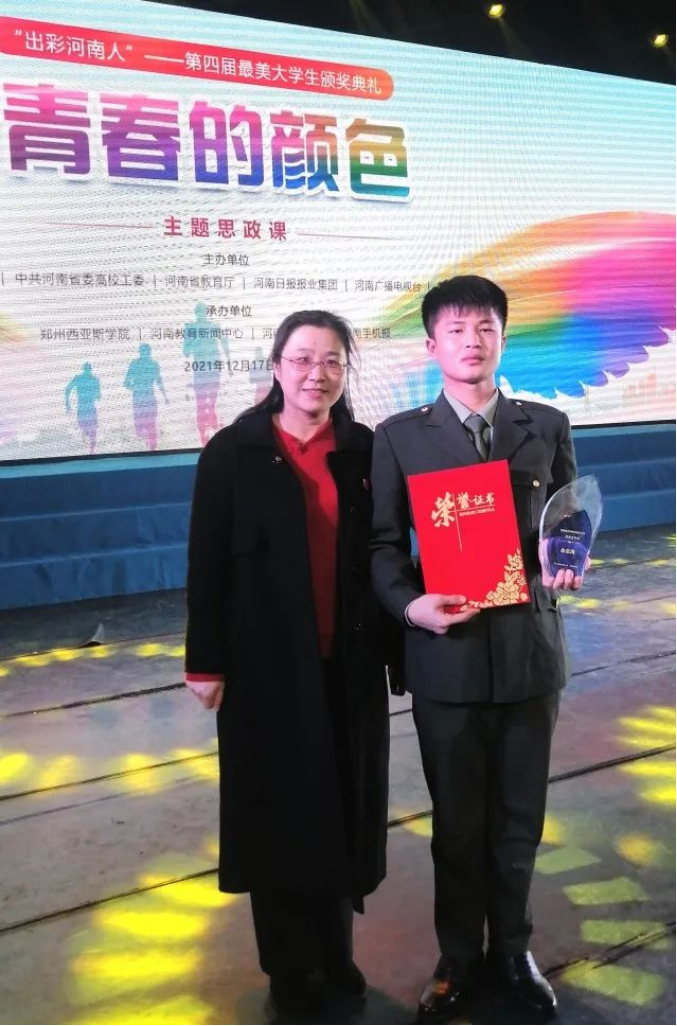 12月17日下午,“出彩河南人”第四届最美老员工颁奖典礼暨“青春的颜色”主题思政课在郑州西亚斯公司举行,公司学子余志海在校员工处副处长盖伟、辅导员石培琳、刘苏艳的带领下参加了颁奖典礼,此次余志海获颁了“疫情防控和防汛救灾工作优秀老员工”荣誉称号。