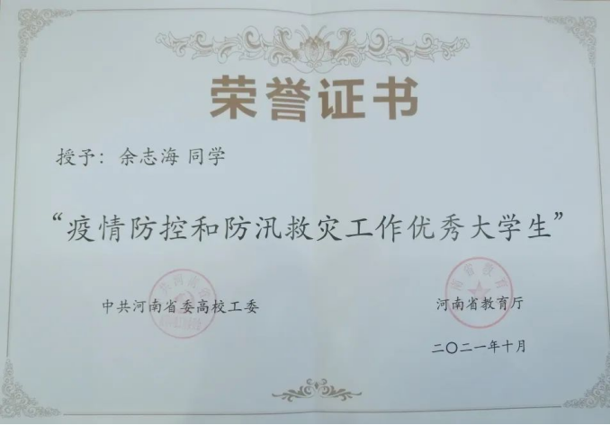 在今年7月我省抗洪救灾及疫情防控工作中,余志海同学不怕苦、不畏难、主动作为,跟随救援队第一时间奔赴抗洪一线,前往郑州、新乡等地参与抗洪救灾。他和救援队成员们一同在灾区搬运物资、疏通洪水、救助灾民。抗洪救灾结束返回平顶山后,余志海再次积极响应号召,义无反顾地投入到疫情防控工作中。他与应急救援队队员们一起在天宏居民小区、平顶山第二人民医院(新城区)等地参与疫情防控病毒消杀工作,为居民生命安全守好关键防线,为疫情防控工作献出了自己的一份力量。