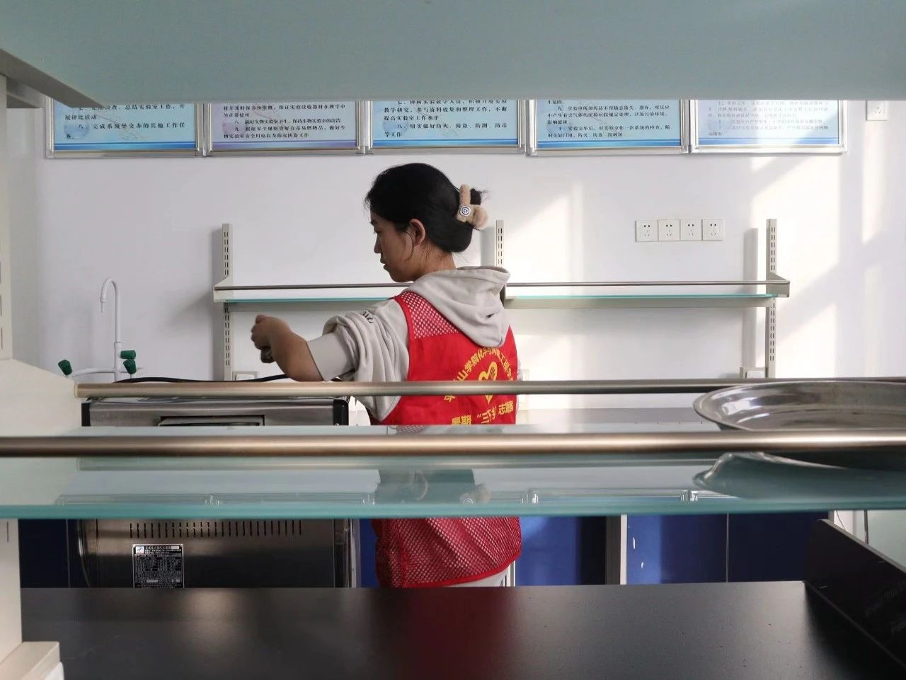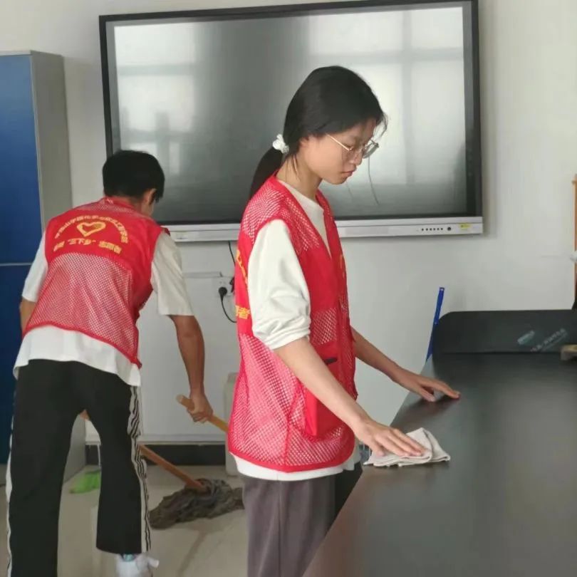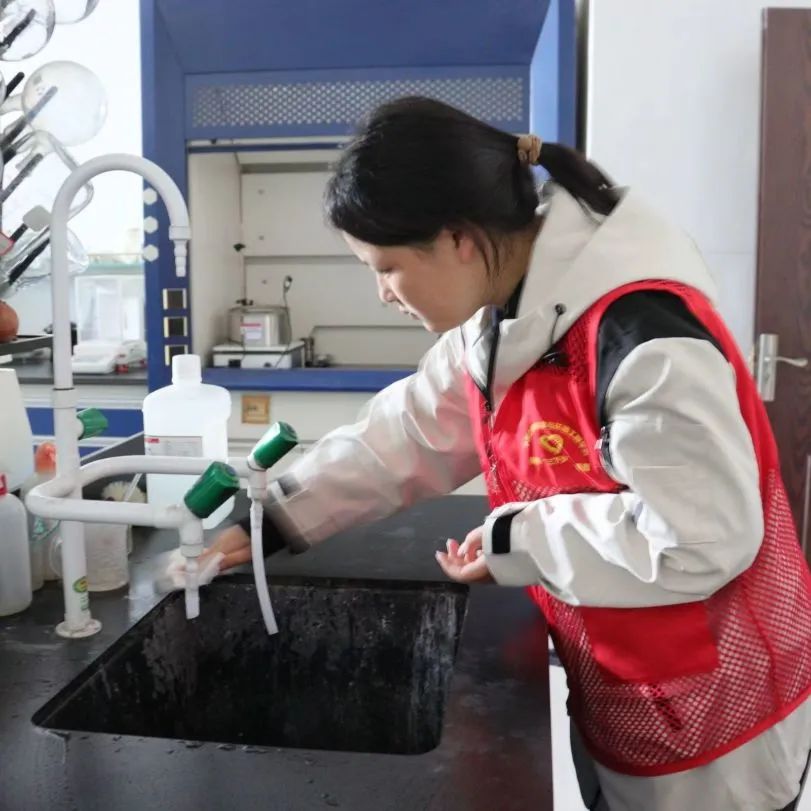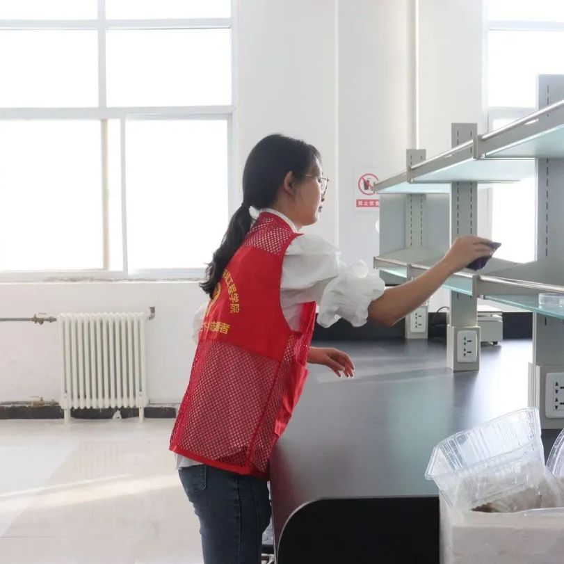活动前期,活动负责人向志愿者们强调了有关安全的注意事项,并安排志愿者们按专业分组负责不同的区域。在清洁过程中,志愿者们身着统一的志愿者服装,纷纷拿起废弃的试管刷、棉签等物品,对洗手池、实验桌、药品柜等进行全面清洁。在志愿者们高质量、高标准的清洁工作下,实验室变得干净明亮,焕然一新。实验桌擦拭得一尘不染,各类物品摆放有序;药品柜中的药瓶按照登记的顺序整齐摆放,分类明确,方便取用。志愿者们“不怕苦”“不怕累”,用自己的实际行动为化学实验楼的整洁贡献出自己的一份力量,为同学们打造了洁净有序的实验环境,提供了更加舒适的学习环境。