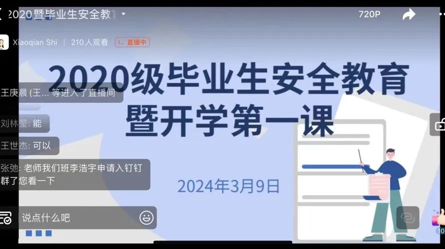 2020级辅导员史小倩线上为同学们讲解了交通安全、信息安全、防诈骗安全等方面知识,并结合毕业生特点,给同学们提供了职业规划和学业发展建议。她鼓励同学们明确目标,确定理想,努力积累经验,不断提升自己的综合素质。同时,她也强调了面对就业压力和挑战时保持积极心态的重要性,希望同学们能调整好心态,积极投身于就业浪潮。