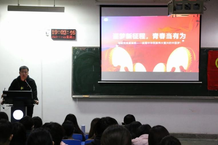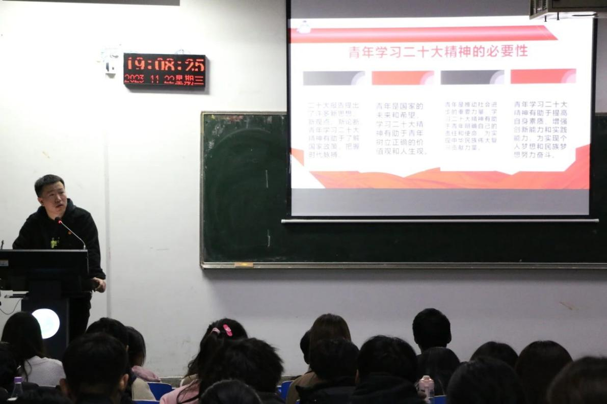 随后,马延明结合党的二十大报告论述了青年与党的二十大的联系,使同学们明确了自身的使命和责任,并通过播放视频,引发同学们对“自身与党的二十大之间有何种联系”这一问题的思考。